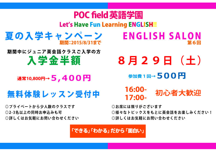 参加費:500円(POC field英語学園クラス受講生は無料です。)